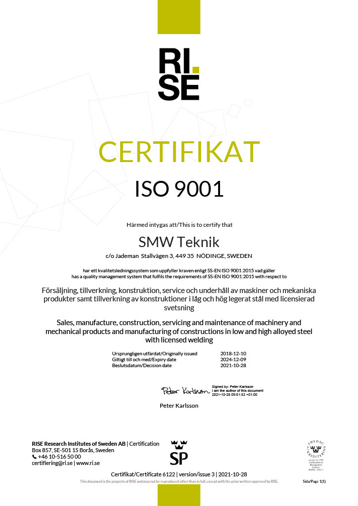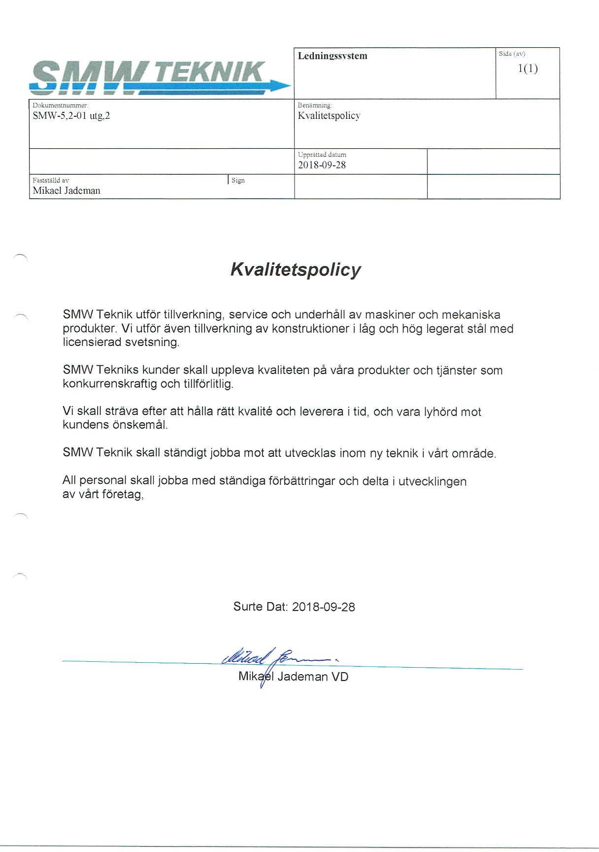 SMW Teknik innehar svetslicenser och svetsprocedurer för bla TIG-svetsning. Vi innehar SSG-kort, fallskyddsutbildning, mobil arbetsplattform, truckutbildning, heta arbeten, IWS (International Weding specialist). Vi är i nuläget i färd med arbetet mot en ISO 9001 certifiering.